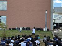 〇練習が終わってほっと一息 〇閉会式で本校生徒が発表している様子