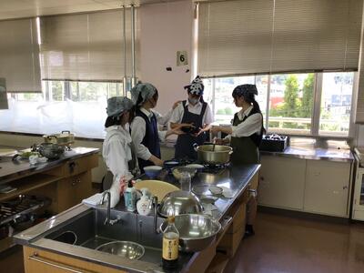 ◆学年混合で班を作り、週に1回調理実習を行っています。各班が作りたいレシピを提出して、順番にリーダーとなり、食材購入から片付けまで担当し、活動しています。10月までに、チョコパイ、フルーツサンド、ラッシー、キンパ、源氏パイ、クッキーなどを作りました。今後は、講師の先生を呼んで講習会も行う予定です。